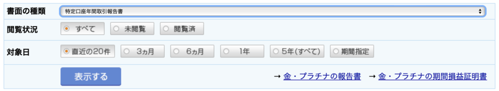 楽天証券にログイン後、「書面の種類」欄を、『特定口座年間取引報告書』にして「表示する」