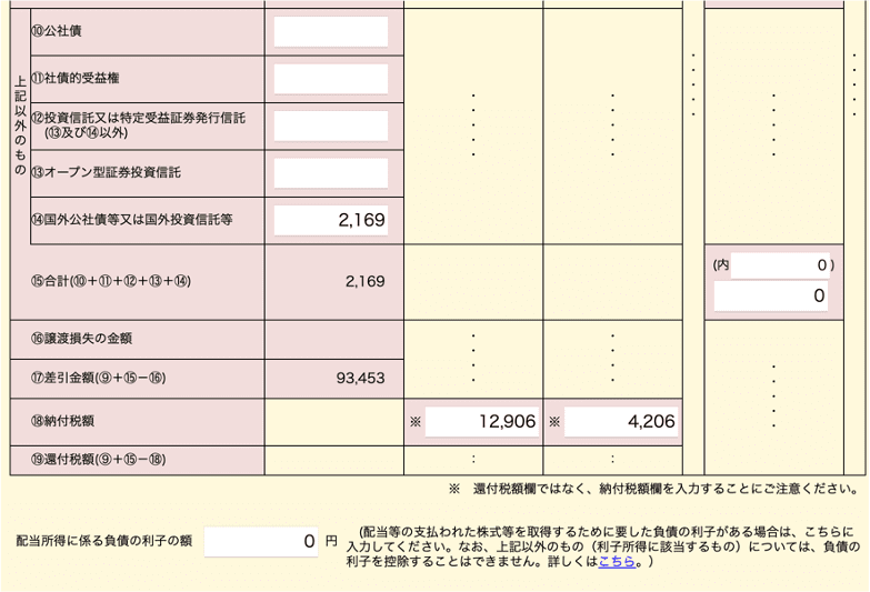 まず去年と同様に株式から得た配当金額を入力していきますが、入力シート下部に「上記以外のもの」と去年は入力しなかった部分があります。ここを手元に用意した『特定口座年間取引書』を見ながら入力していきます。