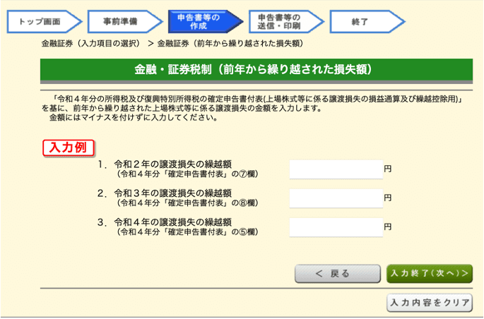 収入や配当等の入力を進めていくと以下のような画面が出てくるので、「繰り越された譲渡損失」を入力していきます。